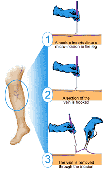 Ambulatory Microphlebectomy is a procedure used to remove large bulging varicose veins. It can be done as a sole treatment or in conjunction with other treatments to get the desired outcome. The skin and the vein are anesthetized with local anesthesia. A small 1–2 mm incision is made in the skin above the vein. The vein is accessed and removed. There are no stitches and little or no scarring after the incisions have healed. After approximately two weeks of healing, full results are evident.